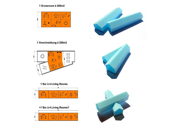 The complexity of the interior space arises not only from the angular intersection of the individual houses but also from the integration of a second geometrical concept. All of the staircases are integrated into expansive, winding organic volumes that figuratively eat their way through the various levels of the building like a worm, sometimes revealing fascinating visual relationships between the various houses, at other times blocking the view. The interior walls are finished in white in order to give priority to the furniture displays.